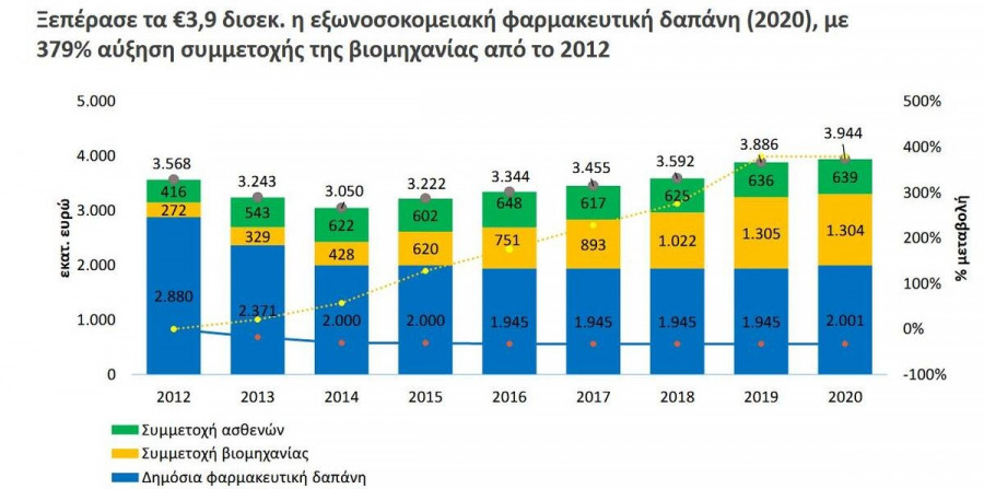 Στον τομέα των δαπανών για φαρμακευτική κάλυψη, στην Ελλάδα η συνολική εξωνοσοκομειακή φαρμακευτική δαπάνη διαμορφώθηκε στα 3,9 δισεκ. ευρώ το 2020 (εκ των οποίων μόλις τα 2,0 δισεκ. ευρώ αποτελούν δημόσια χρηματοδότηση). Το βάρος παραμένει στους ασθενείς και στον ιδιωτικό τομέα, με το μεγαλύτερο μέρος να το επωμίζεται ο φαρμακευτικός κλάδος, μέσω των υποχρεωτικών επιστροφών και εκπτώσεων (clawback & rebates) που καταβάλλει, παρά τις προσπάθειες που καταβλήθηκαν για τη συγκράτησή τους. Αξίζει να σημειωθεί ότι η φαρμακευτική βιομηχανία συνεχίζει να καλύπτει τις ανάγκες των Ελλήνων ασθενών σε φάρμακα, μέσω των υποχρεωτικών επιστροφών, διαθέτοντας δωρεάν πάνω από 1 στα 3 φάρμακα (36%) σε εξωνοσοκομειακό και σχεδόν 1 στα 2 φάρμακα (50%) σε νοσοκομειακό επίπεδο.