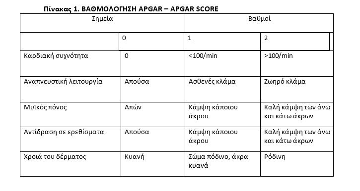 Πίνακας 1. ΒΑΘΜΟΛΟΓΗΣΗ APGAR – APGAR SCORE