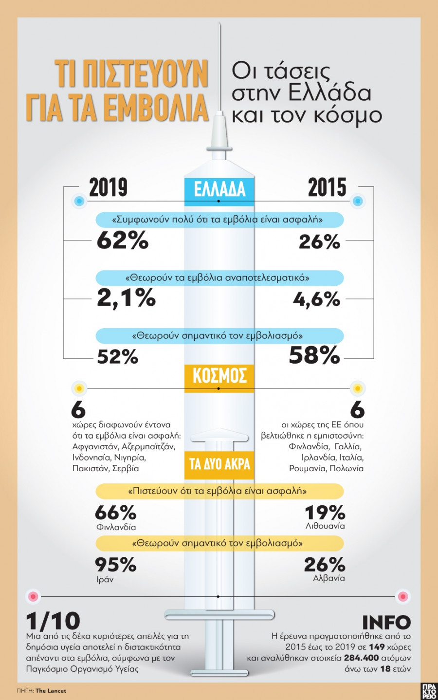 Στην Ευρώπη η κατάσταση φαίνεται να έχει βελτιωθεί μεταξύ 2015-2019, αν και παραμένουν εντυπωσιακές διακυμάνσεις, καθώς το ποσοστό των ανθρώπων που στις αρχές του 2020 -πριν ξεσπάσει η πανδημία Covid-19- συμφωνούσαν κατηγορηματικά ότι τα εμβόλια είναι ασφαλή, κυμαινόταν από 66% στη Φινλανδία μέχρι μόνο 19% στη Λιθουανία".
