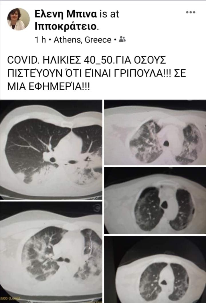 Η κυρία Μπίνα σχολίασε χαρακτηριστικά: «Ασθενείς με θετικό covid, με εικόνα πνευμονικών διηθημάτων (πνευμονία) Άνδρες 40 με 50 ετών. Με συμπτώματα covid και υποξυγοναιμία... 35 εισαγωγές σήμερα. Τα καταφέραμε όμως. Τηρήσαμε όλα τα πρωτόκολλα».