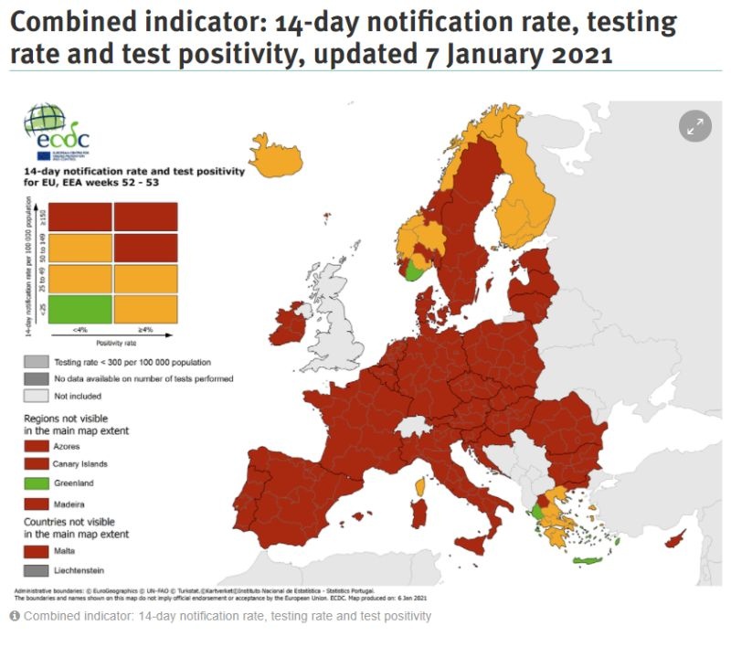 Τα δεδομένα ανανεώθηκαν μέχρι και τις 7 Ιανουαρίου και σε αυτά η Ελλάδα είναι σε κάποιες περιοχές κίτρινη και σε κάποιες πράσινη, σε ό,τι έχει να κάνει με τον ρυθμό μετάδοσης του ιού σε σχέση με τα τεστ που γίνονται.