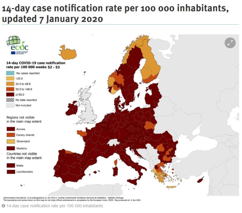 Όλη η υπόλοιπη Ευρώπη βρίσκεται στο «κόκκινο», δηλαδή καταγράφονται πάνω από 150 κρούσματα ανά 100.000 πληθυσμού. Να σημειωθεί ότι το ECDC δεν συλλέγει στοιχεία για τη Βρετανία, την Ελβετία, τις βαλκανικές χώρες (εκτός εκείνων που είναι μέλη της ΕΕ), την Ουκρανία, τη Λευκορωσία και τη Ρωσία.