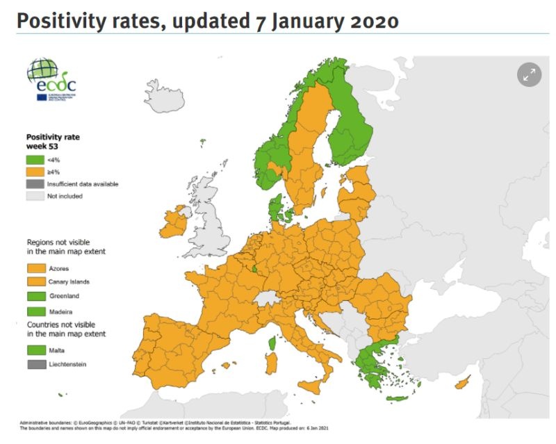 Μείωση του κορονοϊού σε πολλές περιοχές στην Ελλάδα δείχνουν οι αναθεωρημένοι χάρτες του ECDC - Τι ισχύει με τον ρυθμό θετικότητας, τα τεστ και τα κρούσματα ανά 100.000 πληθυσμού.