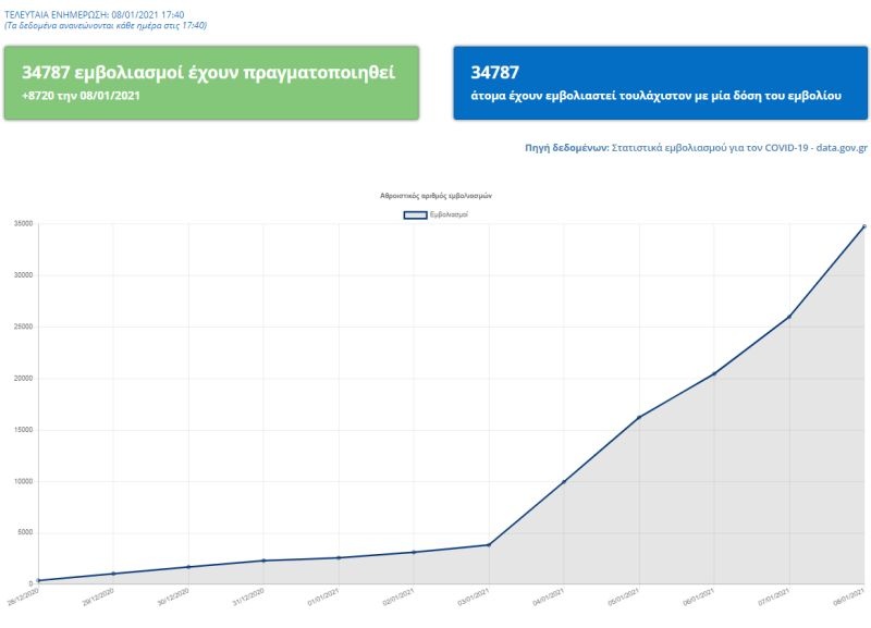 Ενδεικτικό είναι πως το τελευταίο 24ωρο έγιναν 8.720 εμβολιασμοί, ενώ στις 7 Ιανουαρίου είχαν διεξαχθεί 5.538 εμβολιασμοί σε όλη την Ελλάδα. Συνολικά στη χώρα μέχρι και την Παρασκευή 8 Ιανουαρίου, έχουν διεξαχθεί 34.787 εμβολιασμοί κατά του κορονοϊού.