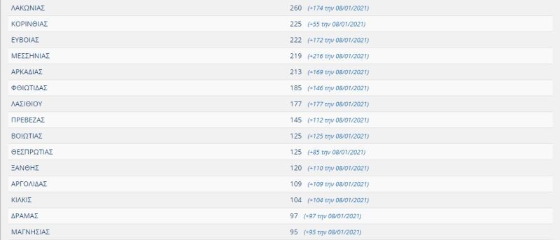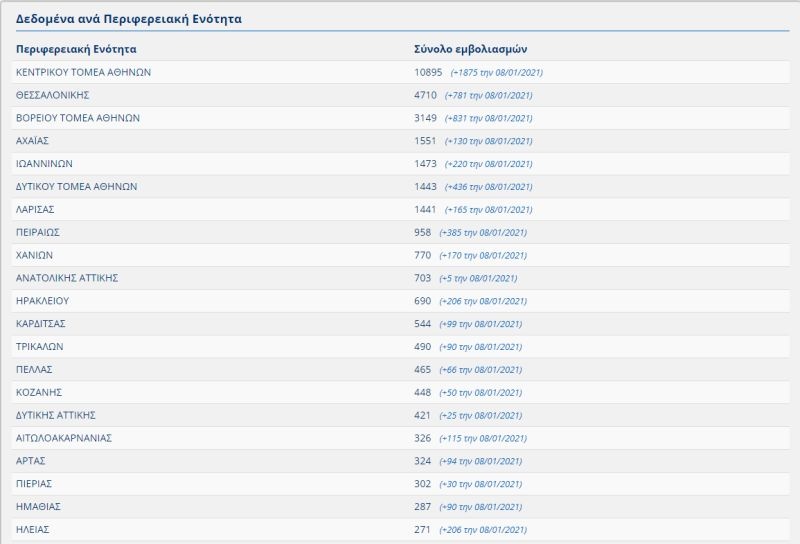 Την Παρασκευή στα δεδομένα που ανακοινώθηκαν προστέθηκαν 17 Περιφερειακές Ενότητες στις οποίες ξεκίνησε η διαδικασία των εμβολιασμών. Συνολικά έχουν διεξαχθεί εμβολιασμοί σε 41 διαφορετικές Ενότητες, με την Αττική να έχει τους περισσότερους καθώς έχουν λάβει το εμβόλιο 17.569 άνθρωποι σε έξι διαφορετικούς τομείς της Περιφέρειας.