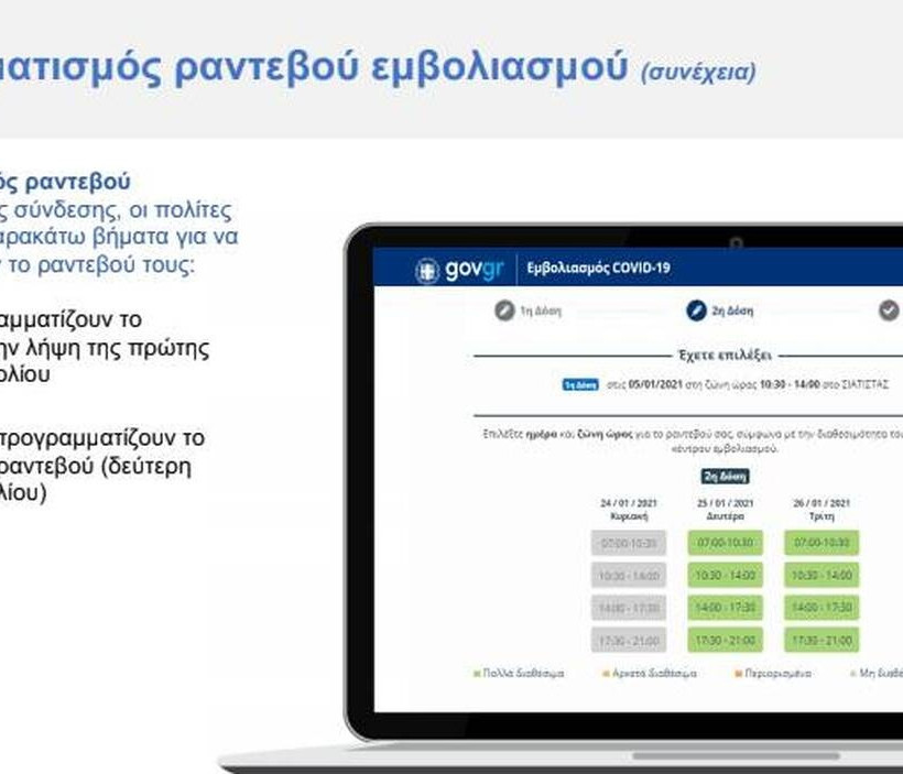 Πώς γίνεται ο προγραμματισμός ραντεβού. Επιλέγω το εμβολιαστικό κέντρο και την ημερομηνία που με εξυπηρετεί για την πρώτη δόση του εμβολίου. Τότε στην οθόνη εμφανίζεται ένας πίνακας με τις κοντινές ημερομηνίες στην επιλεγμένη και οι ζώνες ώρας μαζί με τη διαθεσιμότητα που υπάρχει - πράσινο για πολλά διαθέσιμα ραντεβού, κίτρινο για αρκετά, πορτοκαλί για λίγα και γκρι για μη διαθέσιμα ραντεβού.
