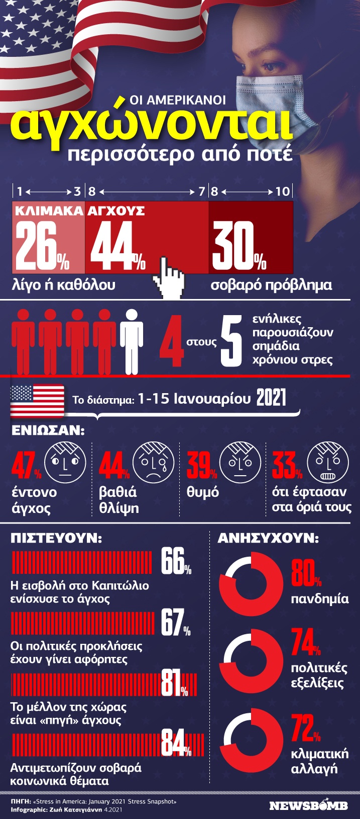 Βέβαια, σε αυτό έχουν συντελέσει και οι σοβαρές πολιτικές αναταράξεις που προηγήθηκαν τους προηγούμενους μήνες και οι οποίες ενέτειναν το αίσθημα του φόβου και αβεβαιότητας για τους Αμερικανούς πολίτες. Και μπορεί στην Ελλάδα να μην ζήσαμε μία ανάλογη σκηνή με την εισβολή των διαδηλωτών στο Καπιτώλιο, όμως οι πολιτικές και κοινωνικές εξελίξεις είναι εξίσου «εκρηκτικές» και στη χώρα μας.