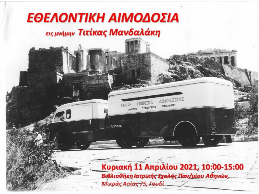 Η ιατρός, Αιματολόγος Καθηγήτρια, π. Δ/ντρια του Β΄ Περιφερειακού Κέντρου Αιμοδοσίας και Αιμορροφιλικών του Λαϊκού Νοσοκομείου Αθηνών, Βασιλική-Αικατερίνη (Τιτίκα) Μανδαλάκη, έφυγε από τη ζωή στις 8 Απριλίου 2020. Στη μνήμη της, διοργανώνεται εθελοντική αιμοδοσία, από την Νοσηλευτική Υπηρεσία Αιμοδοσίας του Γ.Ν.Α «Λαϊκό», στο Αναγνωστήριο της Ιατρικής Σχολής Αθηνών, την Κυριακή 11 Απριλίου 2021 από 10:00-15:00.