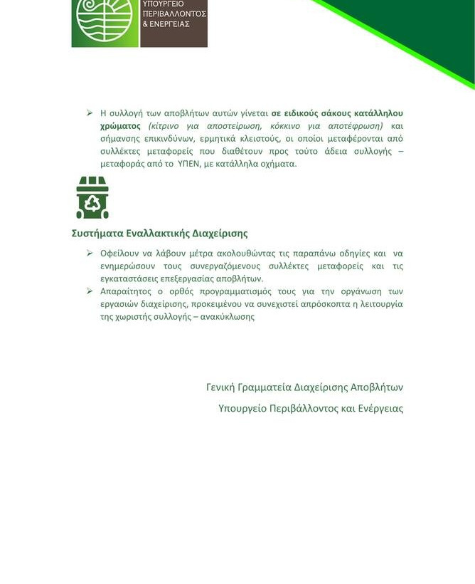 Τέλος υπενθυμίζεται ότι ισχύουν και οι γενικές οδηγίες για τα απόβλητα Covid-19.