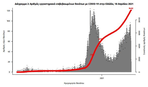 Η διαχρονική εξέλιξη των συνολικών κρουσμάτων και συνολικού αριθμού των θανάτων ασθενών COVID-19 παρουσιάζεται στο ακόλουθο διάγραμμα.