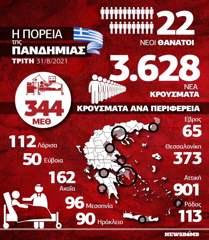 Την Τρίτη (31.08), επιβεβαιώθηκαν 3.628 νέα κρούσματα στη χώρα, ενώ δυστυχώς καταγράφηκαν 22 ακόμα θάνατοι. Οι διασωληνωμένοι έφτασαν στους 344, με τους 319 από αυτούς να είναι ανεμβολίαστοι οι μερικώς εμβολιασμένοι. Ανησυχητικός και ο δείκτης των εισαγωγών, που έφτασαν τις 239 το τελευταίο 24ωρο καταγράφοντας αύξηση 11,68%.