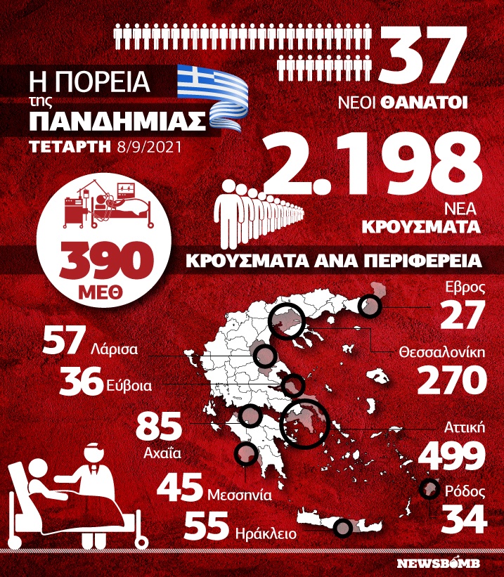 Αναφορικά με την επιδημιολογική κατάσταση στη χώρα, όπως ανακοινώθηκε σήμερα από τον ΕΟΔΥ, εντοπίστηκαν 2.198 νέα κρούσματα. Ωστόσο, αυτό που προκαλεί προβληματισμό είναι η αύξηση στους θανάτους και δη στους διασωληνωμένους το τελευταίο διάστημα. Ειδικότερα, το τελευταίο 24ωρο επιβεβαιώθηκαν δυστυχώς 37 νέοι θάνατοι, ενώ οι συμπολίτες μας που νοσηλεύονται στις ΜΕΘ έφτασαν στους 390 καταγράφοντας νέα αύξηση σε σχέση με την Τρίτη.