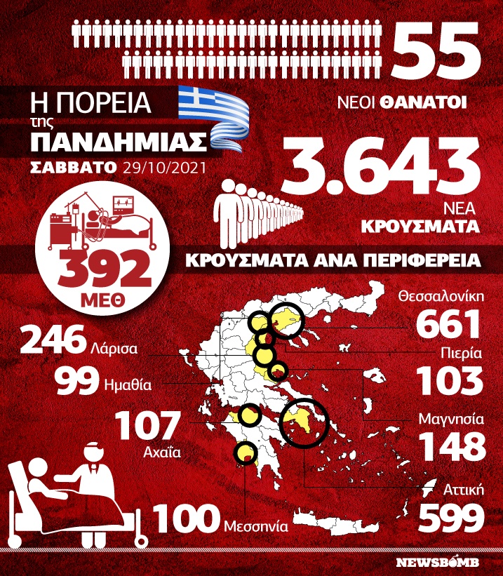 Κορονοϊός – Όλες οι ειδήσεις: Πάνω από τις 3.600 και πάλι τα σημερινά κρούσματα σε όλη την Επικράτεια - Ανησυχία για τον υψηλό αριθμό νεκρών ημερησίως και την πίεση στο ΕΣΥ, ειδικά στη βόρεια και κεντρική Ελλάδα. Όλα τα στοιχεία στο Infographic του Newsbomb.gr.
