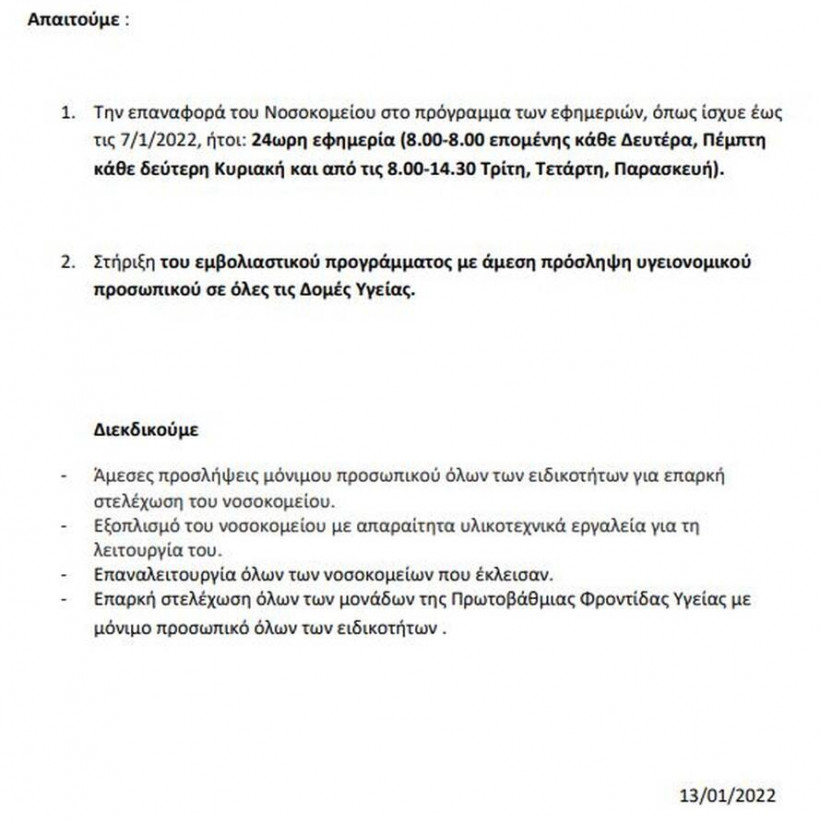 - Την επαναφορά του Νοσοκομείου στο πρόγραμμα των εφημεριών, όπως ίσχυε έως τις 7/1/2022, ήτοι: 24ωρη εφημερία (8.00-8.00 επομένης κάθε Δευτέρα, Πέμπτη κάθε δεύτερη Κυριακή και από τις 8.00-14.30 Τρίτη, Τετάρτη, Παρασκευή).