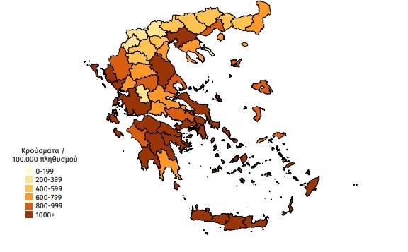 Γεωγραφική διασπορά: Ο χάρτης αποτυπώνει τη γεωγραφική κατανομή των κρουσμάτων COVID-19 των τελευταίων 14 ημερών ανά Περιφερειακή Ενότητα της χώρας, με βάση την δηλωθείσα διεύθυνση μόνιμης κατοικίας του ασθενούς, ή τη διεύθυνση προσωρινής διαμονής για τους τουρίστες και άλλους προσωρινά διαμένοντες στην Ελλάδα. Συμπεριλαμβάνονται τόσο κρούσματα με ιστορικό ταξιδίου (“εισαγόμενα”) όσο και κρούσματα με πιθανή εγχώρια μετάδοση.
