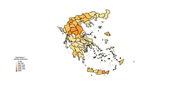 Γεωγραφική διασπορά: Ο χάρτης αποτυπώνει τη γεωγραφική κατανομή των κρουσμάτων COVID-19 των τελευταίων 14 ημερών ανά Περιφερειακή Ενότητα της χώρας, με βάση την δηλωθείσα διεύθυνση μόνιμης κατοικίας του ασθενούς, ή τη διεύθυνση προσωρινής διαμονής για τους τουρίστες και άλλους προσωρινά διαμένοντες στην Ελλάδα. Συμπεριλαμβάνονται τόσο κρούσματα με ιστορικό ταξιδίου (“εισαγόμενα”) όσο και κρούσματα με πιθανή εγχώρια μετάδοση.