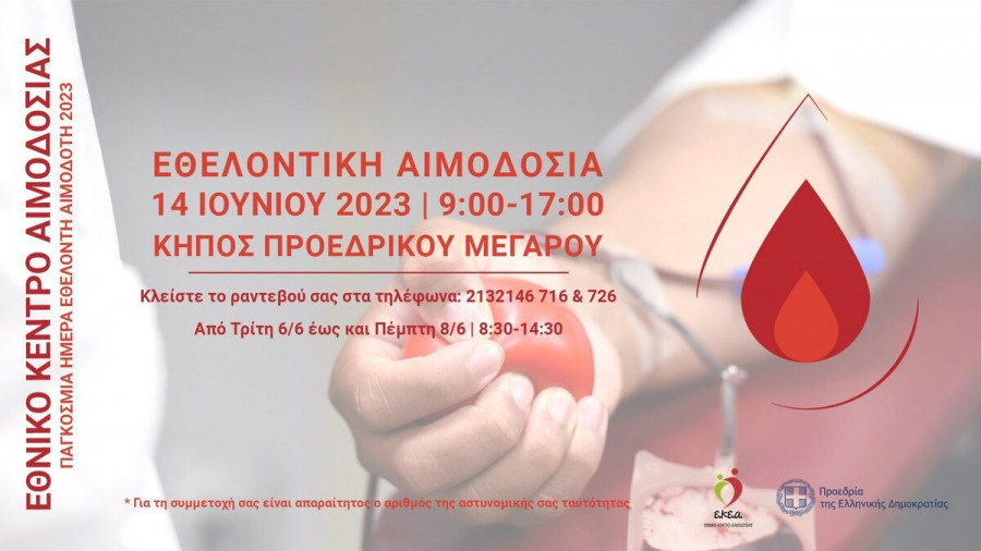 Το Εθνικό Κέντρο Αιμοδοσίας θέλοντας να ευχαριστήσει όλους τους ανώνυμους εθελοντές αιμοδότες, που στηρίζουν διαχρονικά το Εθνικό Σύστημα Αιμοδοσίας διοργανώνει μία ιδιαίτερη αιμοδοσία, με υψηλό συμβολισμό, στον κήπο του Προεδρικού Μεγάρου, την Τετάρτη 14 Ιουνίου (09.00πμ-17.00μμ), υπό την αιγίδα της Προέδρου της Δημοκρατίας, Κατερίνας Σακελλαροπούλου. Στην αιμοδοσία θα συμμετάσχουν μέλη της Προεδρίας της Δημοκρατίας και πολίτες εθελοντές αιμοδότες σε μία πρωτοβουλία, η οποία έχει σκοπό να αναδείξει τη συστράτευση ανθρώπων που υπηρετούν κοινές ανθρωπιστικές αξίες μέσα από τη συμμετοχή τους σε καθημερινές δράσεις που προάγουν την κοινωνική συνοχή.