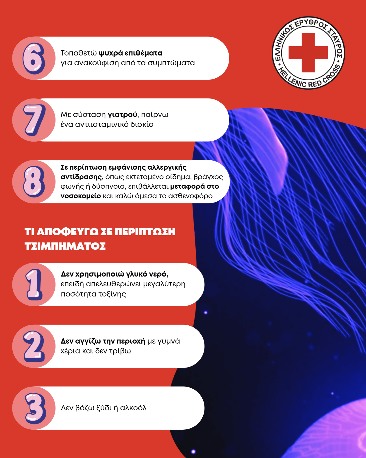 Σημαντική ενημέρωση του Ελληνικού Ερυθρού Σταυρού για τα κατάλληλα μέτρα αντιμετώπισης τσιμπήματος από μωβ μέδουσα
